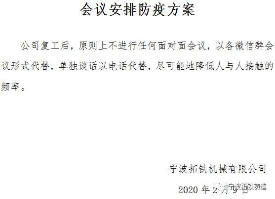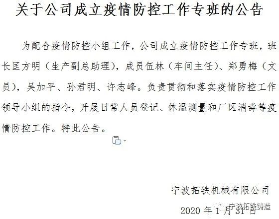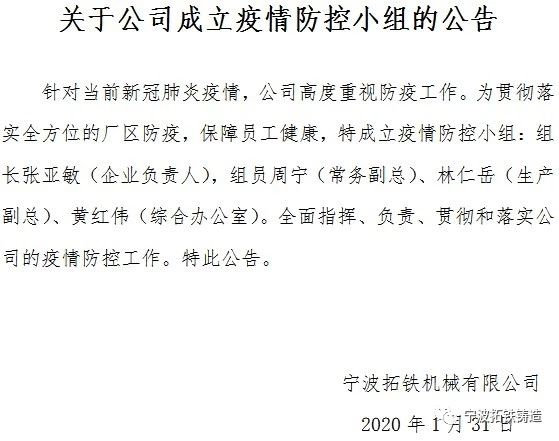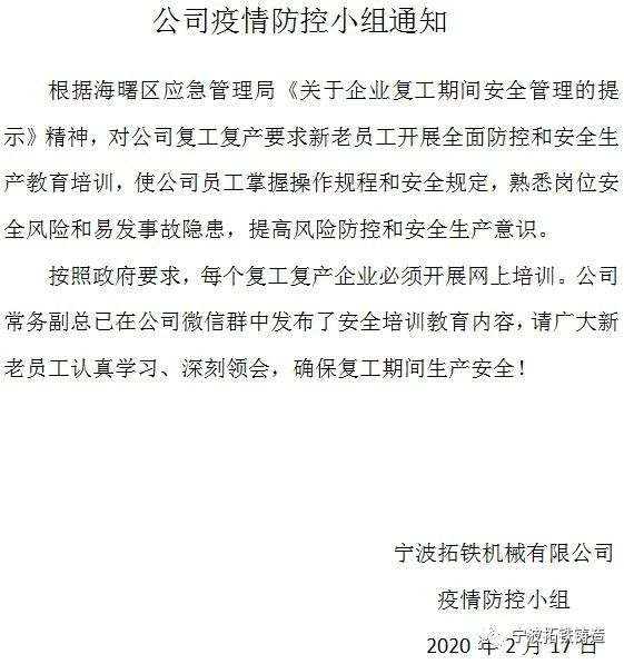 我们共同期望本次疫情立即解除,百姓安康、国家昌盛。相信风雨后总会有彩虹。我们在此再次呼吁拓铁的全体员工们,一定要牢记和贯彻政府与公司的疫情防控原则,众志成城,一起打赢本次的疫情战。